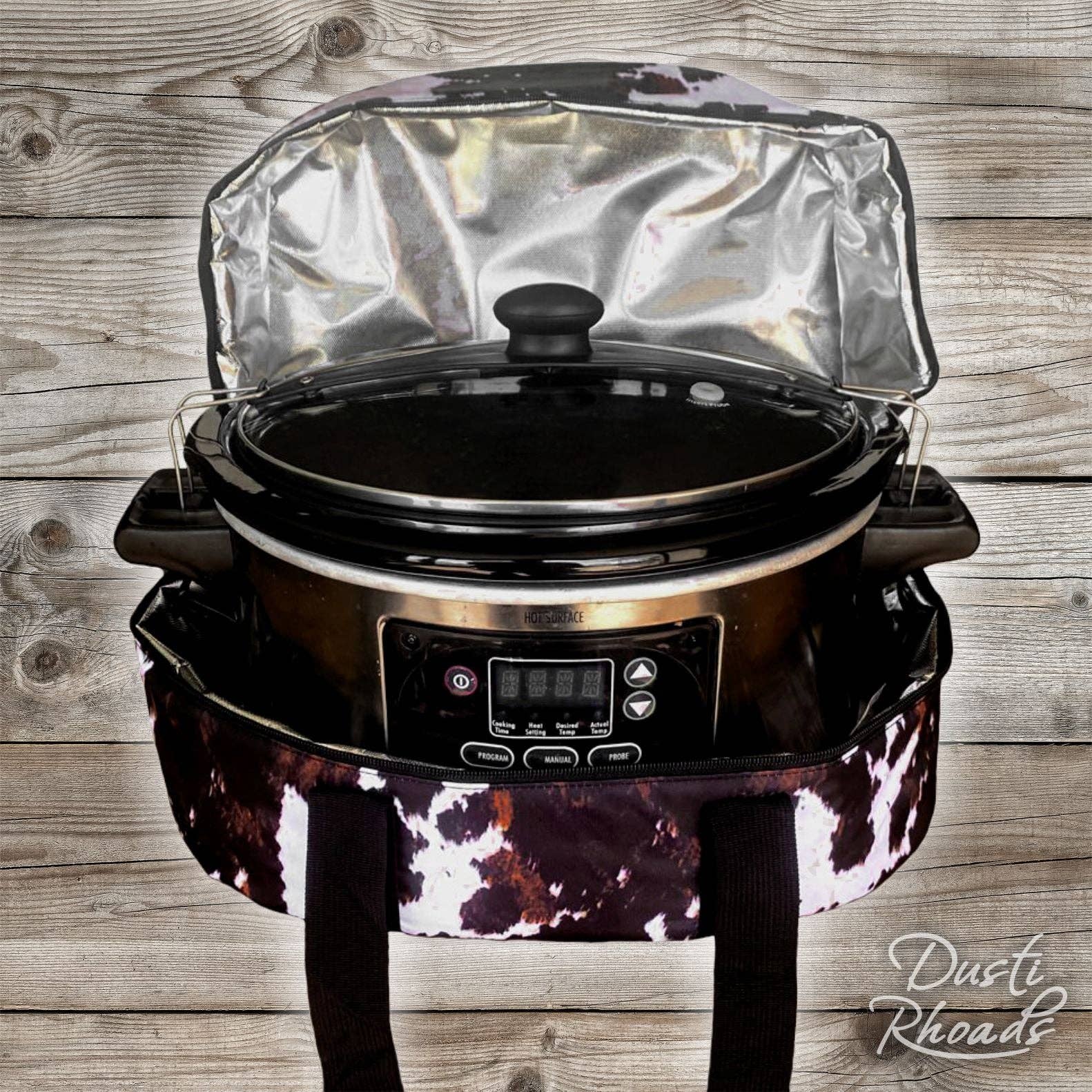 Insulated crockpot carrier features a zipper in the center, carrying handles with a Velcro clasp at the top, and a zippered pocket on top for carrying utensils - Great for keeping food cool or warm.