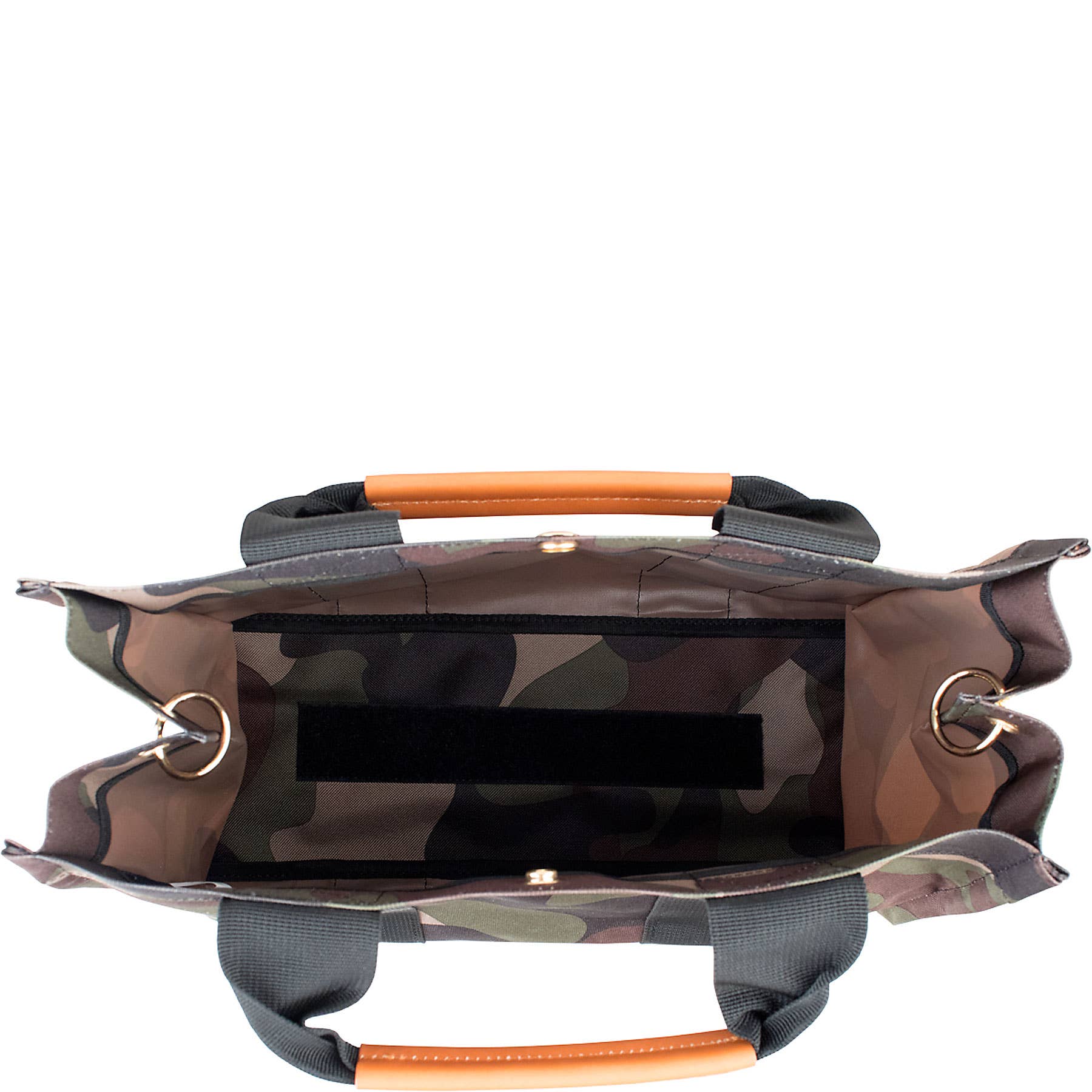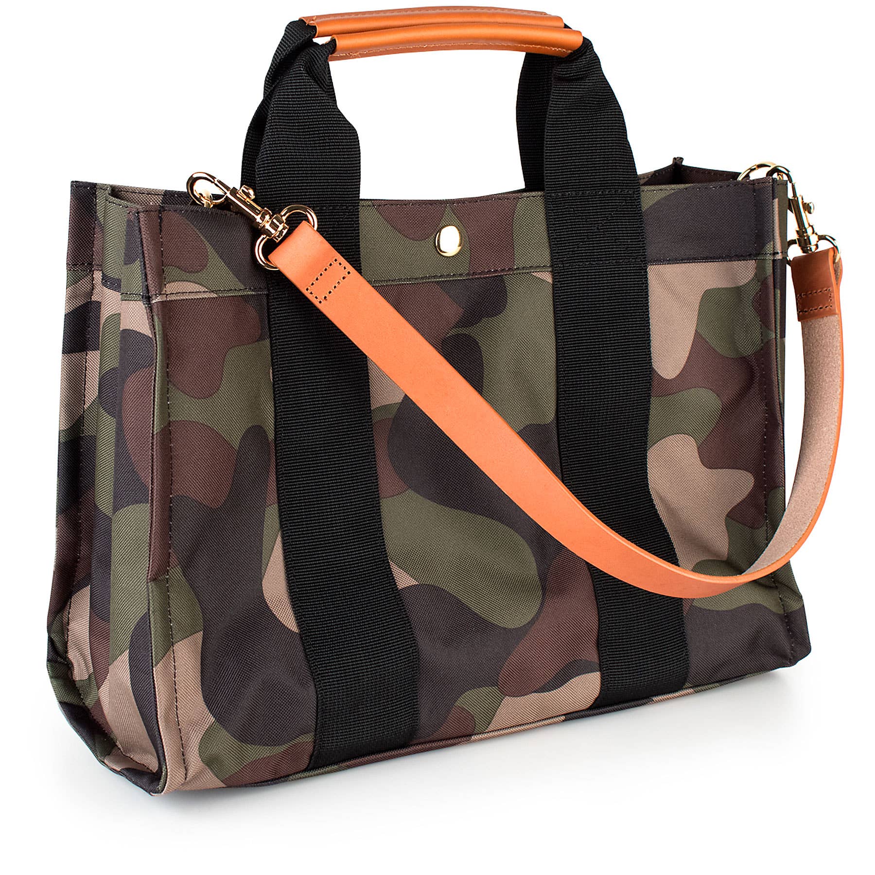 features a removable organization insert, top carry handles, removable shoulder strap, flat base for stability, Italian Vegetable tanned leather accents and top snap closure