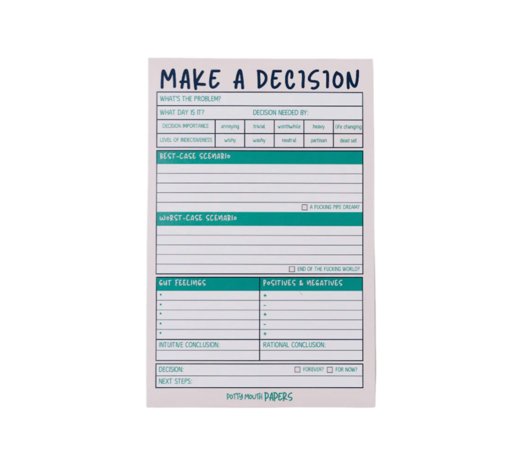 Stop being indecisive and have some fun with the Make A Decision Notepad! This quirky notepad (8.5x5.5", 50 sheets) will finally help you make a decision (or at least make you laugh while trying). Made in the USA, this funny notepad is perfect for all your decision-making needs.