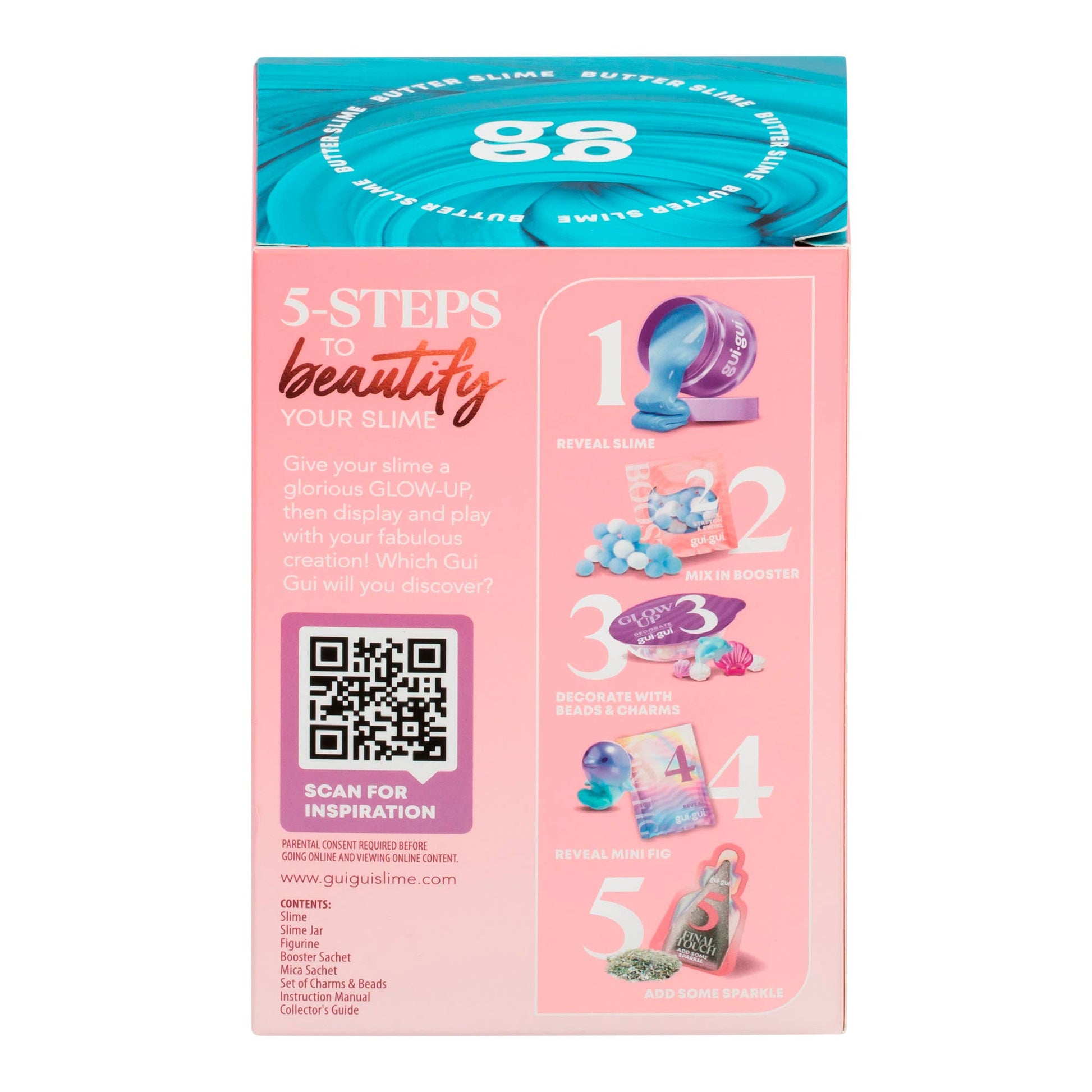 Get ready to glow-up your slime game with the Gui Gui scented slime collection, the ultimate DIY slime experience for kids, collectors, and sensory play lovers! With 13 different slimes to create and collect, each featuring one of four amazing textures—Gloss, Clear, Butter, and Cloud—Gui Gui offers endless possibilities for mixing, stretching, and styling. Every slime is infused with irresistible fragrances and comes with sparkling charms, surprise figurines, and deco packs to customize your creation. Just follow five easy steps to slay your slime styling and show off your one-of-a-kind masterpiece!
